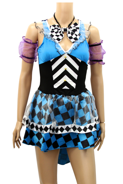 ふしぎの国でティーパーティー♪カラフルポップなマッドハッター風のコスプレ衣装。ブルーをベースに紫×黒とハーリキンチェック柄を随所にちりばめたオシャレでポップなミニドレス。ハーリキンチェック柄で軽やかなスカートをお探しの方にもぴったり♪ドレスは柔らかな素材を使用したノースリーブのワンピースタイプ!後ろ丈が長いハイロウタイプのスカートは、シースルーのオーガンジー生地を重ねたレイヤードデザイン。さらに、マッドハッターの特徴でもある「10/6」ミニハットと首リボン、シースルーのアームバンドもセット!絶妙な色使いで魅せる女性版マッドハッター風のハロウィンコスチュームです。スカート部分にもハーリキンチェック柄で拘りたい方や、流行り廃りの無いシンプルなデザインで楽しめるかわいいタイプのチェック柄に目がない方にもお勧めです♪。※セット内容以外は付属しておりません。