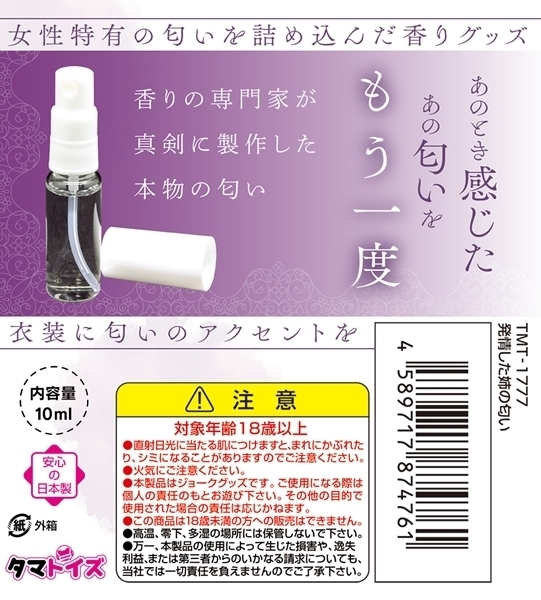 香りの専門家が真剣に作り上げたリアルな香りグッズ♪女性特有の香りを忠実に再現しました!本能を刺激するフェロモンを感じられる特別な香り♪衣装や小物にワンポイントのアクセントとして使えます!どこか懐かしく、心地よい気持ちに包まれる香り体験♪新感覚の香りで気分転換やリラックスタイムにおすすめ!一度嗅ぐと忘れられないリアルさをお楽しみください♪お部屋の雰囲気を香りで変える新しい楽しみ方!日常の癒しタイムをさらに充実させましょう♪●TMT-1777