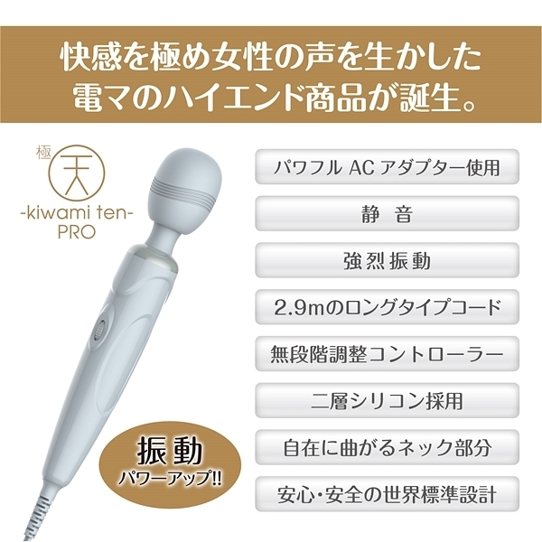 2016年発売より売上を伸ばし続けている極天。発売7年目を記念し、快感を極め女性の声を生かした電マのハイエンド商品をご用意しました。2.9mのロングタイプコードで、電池切れの心配も無く、強烈振動・従来商品以上のハイパワー振動をお楽しみ頂けます。振動強度を自在に操るダイヤル式で、微細振動から貫くような激震動まで無段階に制御可能です。・パワフルACアダプター使用・無段階調節コントローラー・静音・二層シリコン採用・強烈振動・自在に曲がるネック部分・2.9mのロングタイプコード・安心、安全の世界標準設計 <本体仕様電圧>AC100−240V対応プラグ