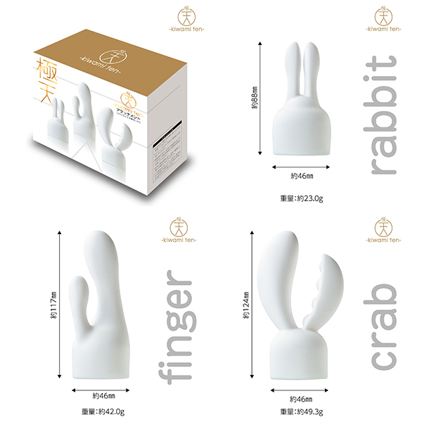 2016年発売より売上を伸ばし続けている極天。快感を極め女性の声を生かした電マのアタッチメントをご用意しました。〜やさしく、激しく、絶頂へ導く〜デンマ用のソフトアタッチメントです。約45mm〜46.6mmのヘッドに対応。からだにやさしいシリコン素材。3種類のパターンで様々なシーンでお楽しみ頂けます。<finger>疑似バイブや挟み込めば手ごろな手コキ感覚を担当出来ます。<rabbit>間に挟んだり、押し当てたり、様々なシーンでご利用可能!<crab>女性は挿入とクリ○リスのW刺激で快感倍増?(デンマ用)(シリコン採用)(パターン3種)(水洗い可能)(安心・安全の世界標準設計)<使用上のご注意>・小さなお子様の手の届かないところで保管してください。・シンナー、アルコールなどで絶対にふかないでください。・使用後はきれいな布で表面をふいてください。中性洗剤または専用洗剤を使用してください。・本体に異常を感じたり、変形・破損した場合は使用しないでください。