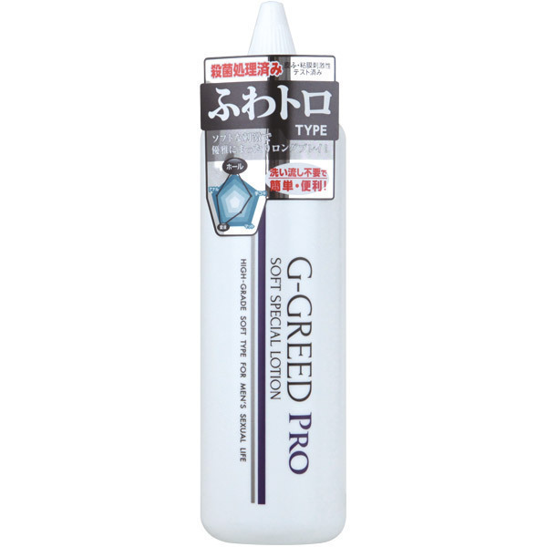 ふわっと軽くてトロトロ!クセになる優しい使用感、水溶性の洗い不要ローション「G-GREED PRO(ソフトスペシャル) 300g」。●回転する先端ノズルによりオナホールへの挿入が簡単●ポリアクリル酸ナトリウムは入っていません●肌への負担が少ない弱酸性●無着色・無香料●内容量300g。殺菌処理および肌へのパッチテスト済み!衛生面も安心なスペシャルローションで充実のオナニータイムを。