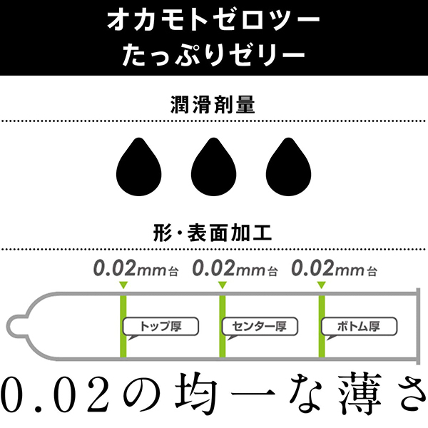 コンドームに塗布されるゼリーの量が多い商品を求める皆様にお応えした「オカモトゼロツー たっぷりゼリー」、ゼリー量200%(オカモトゼロツースタンダード比)、スムーズな挿入感を目指した女性にやさしいオカモトゼロツー。カラーはクリアで日本製・