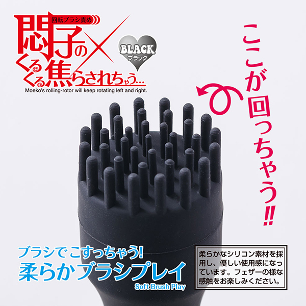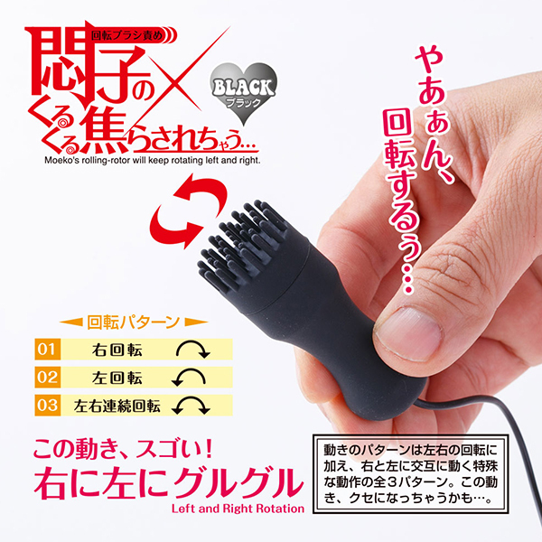 ブラシのヘッドが右に左に回転してピンポイントに刺激!シリコン製のやわらか突起が無数に配置された回転タイプのローター「悶子のくるくる焦らされちゃう」です。ブラックカラーがシックな雰囲気で回転の強弱は10段階から選択可能!クリや乳首などの気持ちいいところを左右に回転する無数のシリコン突起で刺激。これまでの普通のローターでは感じられないイカせ技が楽しめます♪回転の動きは左右を切り替えられて、途中で反転させたり左右に連続して切り替わるモードも楽しめます。フェザータッチのような回転刺激や焦らしプレイ、さらにはローションとの合せ技でも気持ちよさが倍増しそうですね♪電源は単四電池4本を使用した電池式なので簡単に扱えて、コントローラーの操作も簡単です。普通のローターにはない新感覚の気持ちよさをぜひお楽しみください♪