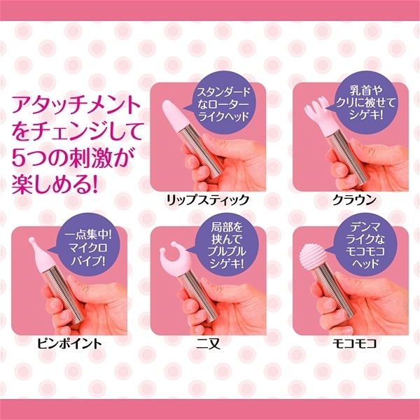 5つのアタッチメントをチェンジして楽しめる5WAYスティックローター。滑らかなシリコンヘッドはローターライクな使い方が楽しめるリップスティックタイプと乳首等を挟んで刺激出来るクラウンタイプ、一点刺激が楽しめるピンポイントタイプ、局部を挟んで刺激する二又タイプ、デンマライクに楽しめるモコモコタイプの5種類。3.7Vのハイパワーリチャーブルバッテリー搭載。60分充電で90分の使用が可能です(使用環境により大幅に増減します)。IPX6の防水性能だからしっかり洗えて水場でも遊べます。振動パターンは10種で色々な振動が楽しめます。