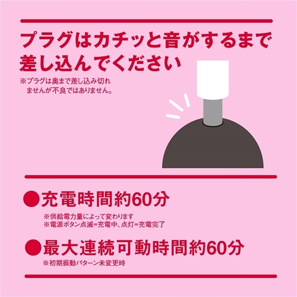 手のひらサイズで悶絶イキ快感!PPPより見た目の可愛いミニデンマが登場。見た目を裏切る超ハイパワーで絶頂快感!肌ざわり滑らかで高品質のサラサラぷにっとヘッドが360度可動するのでぴったりフィットして感度UP!ボタンひとつの簡単操作で多彩な9パターン振動が楽しめる!こっそり遊べる静音設計。防水機能:IPX6でお手入れ簡単。充電時間約60分(供給電力量によって変わります)最大連続稼働時間約60分(初期振動パターン未変更時)、付属品:USBフォーンプラグ式充電ケーブル※IPX6:放水ノズルを使って噴流水を最低3分間あてる試験(浸水は不可となります)●カラー:ブラック
