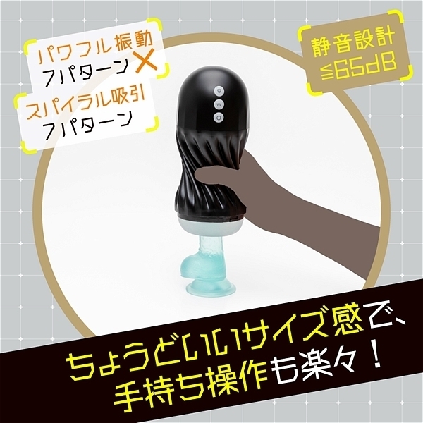 ギュルギュル吸い付く超絶バキューム!芯まで響くヘビー級振動!ハイクオリティ電動オナホが登場!スパイラル吸引7パターン×パワフル振動7パターン!新感覚のねじって搾り取るスパイラル吸引マシーン!初心者にも優しく使いやすい電動ホールです。シンプルボタンでカンタン操作!ホールを取って洗うだけなので後処理簡単!ちょうどいいサイズ感で手持ち操作も楽々!インナーホールは360°びっしりの玉イボ超密着刺激!ぷにっと柔らかい優しい肌触りの超肉厚挿入口!直接肌に触れるものだから、安全性と感触にこだわった高品質なエラストマーを使用しています。耐久性抜群の高弾力もっちり素材です。静音設計≦65dB。充電用USBケーブル付属。※本体は水洗いしないでください。ホール部分のみ水洗い可能です。