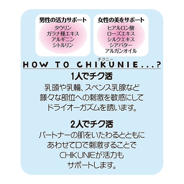 デリケートな乳首のために開発された潤滑ローション。格別なチクニーことチクオナのために研究を重ね、独自配合した成分で安心安全の快感をお約束。洗い流し不要、口に入れても安心で男女ともにご使用いただける一級乳首用ローションです。すりあわせて温めた清潔な手に適量を取り、円を描くように優しくマッサージすることで素手では味わえないハイグレードな快感を体感できます。ヒアルロン酸、ローズエキス、シルクエキス、シアバター、アルガンオイルを贅沢に配合。さらにアルギニンやシトルリンの効果で興奮度もサポートします。塗って興奮、舐めて興奮のWサポートで2にト同時にスペシャルな快感を味わいましょう!