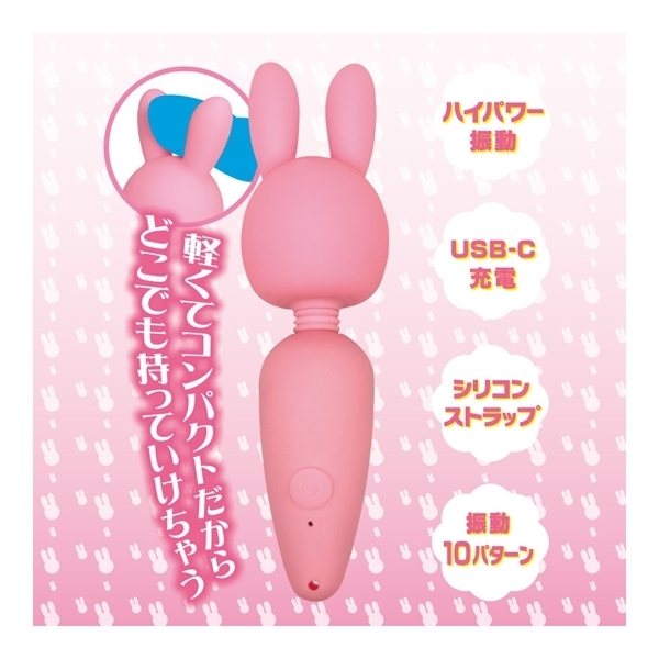 カワイイ見た目でとってもパワフル!USB-C対応の充電式ミニ電マが新登場!全長104ミリの小さくて可愛いミニサイズの電マです。小さなボディに、高出力の充電バッテリーとハイパワーな振動モーターを内蔵しました。アクションパターンは10種類もありますので、お好みの振動を見付けましょう!さらに、充電方法に最新となるUSB-C方式対応。お使いのスマホ充電環境で、そのままで充電できます。乾電池要らずなのでコスパも抜群。不意な落下を防ぐ、オシャレなシリコン製ストラップ付き。スベスベで肌ざわりの良い、ヘッド部シリコン素材。軽いからどこでも持っていける、重さ36グラム。自由に曲がる、フレキシブルネック。充電時間約90分で、連続稼働約60分。「ラビット」は、可愛いウサ耳が特徴的なラブリーデザイン。はさんで、つまんで、さしこめちゃう♪初めての方でも大満足の、チャーミングでラブリーなミニ電マ!●ピンク